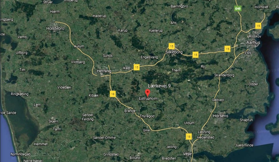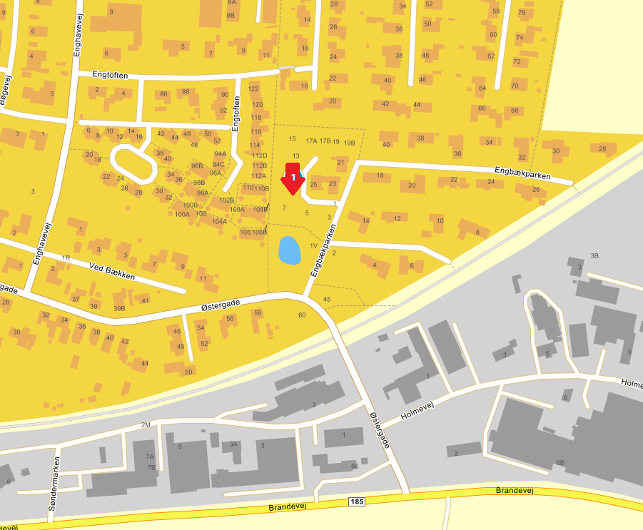 Den røde markør ca. i midten på billedet viser adressen og giver et billede af, hvor du skal dreje ind når du nærmer dig.